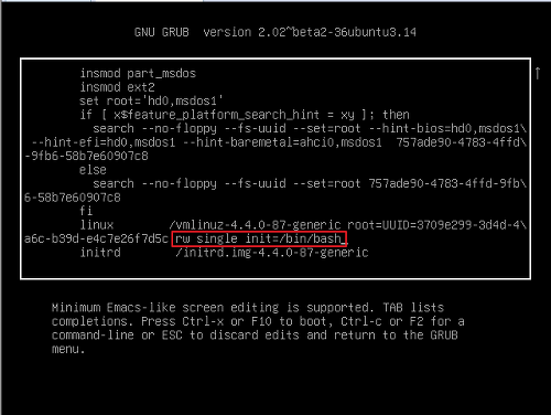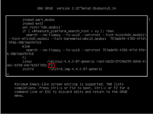 진입 후 아래 사진과 같이 ro로 표시된 부분을 rw single init=/bin/bash로 변경한 뒤에 Ctrl +x 나 F10을 눌러 부팅시켜줍니다.