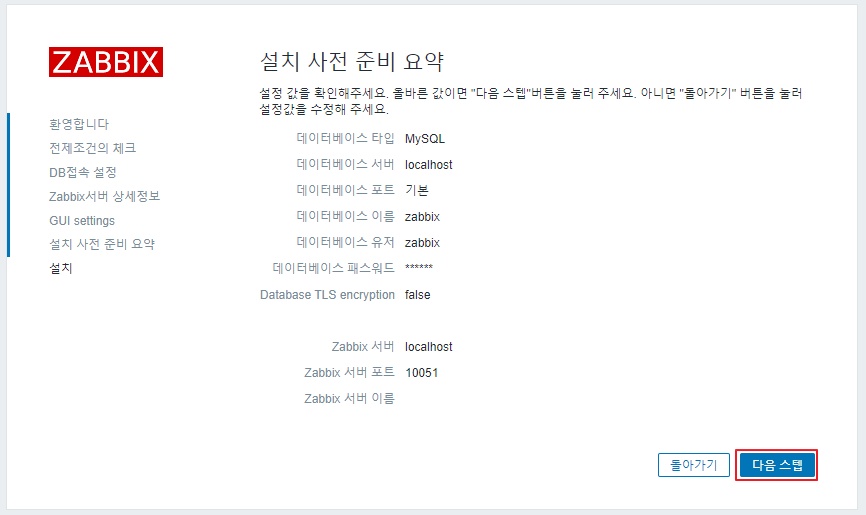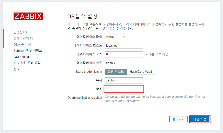 $ mysql -uroot -p'패스워드' -e "grant all privileges on zabbix.* to zabbix@localhost identified by 'zabbixDB패스워드';"