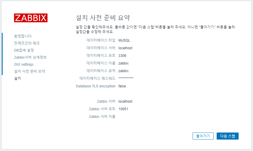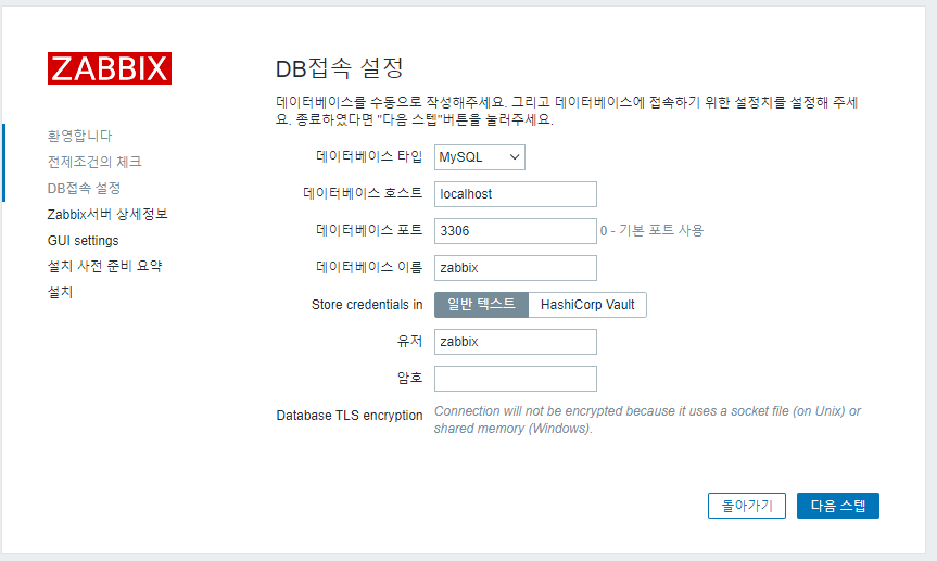 mysql> grant all privileges on zabbix.* to zabbix@localhost identified by "DB패스워드";