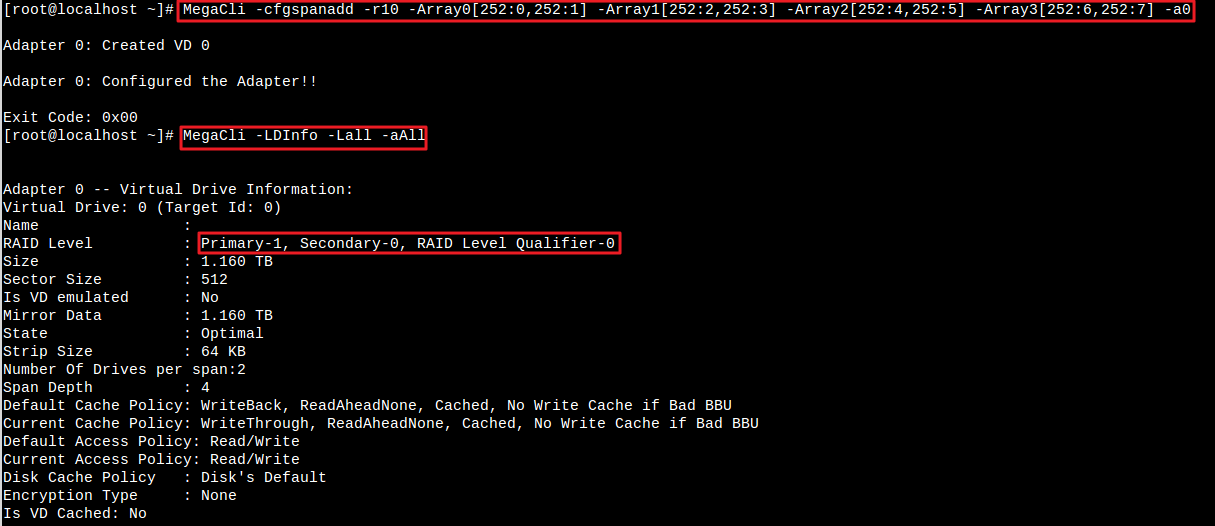 디스크 8개 – 레이드 10으로 묶을 때MegaCli -CfgSpanAdd -r10 -Array0[252:0,252:1,252:2,252:3] -Array1[252:4,252:5,252:6,252:7] -a0