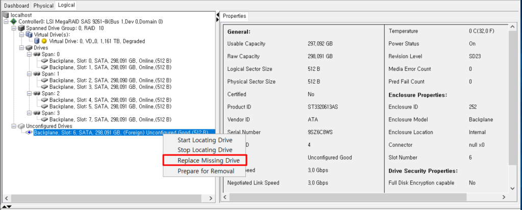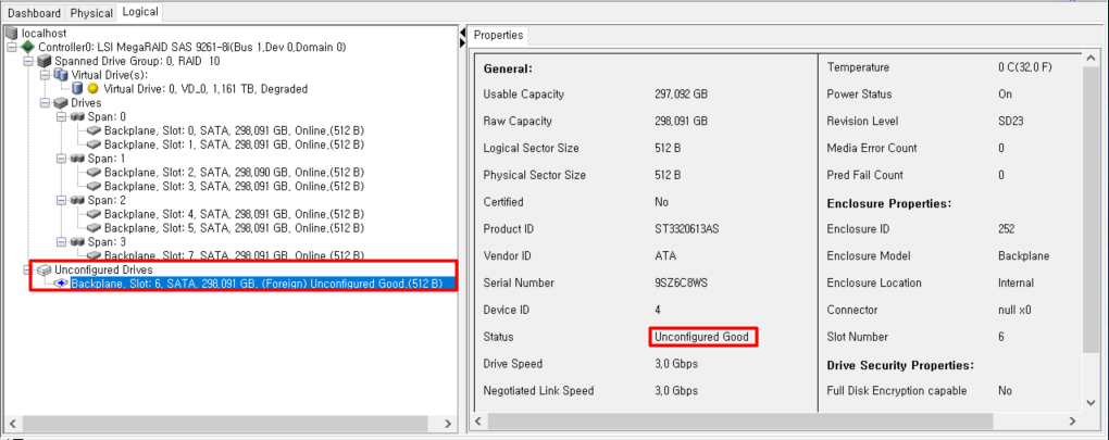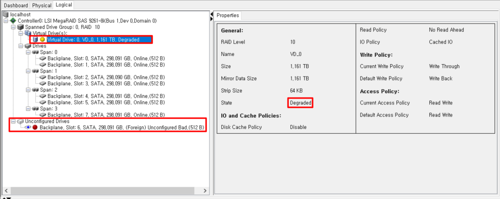 현재상황 : 레이드 6번 디스크가 망가졌다는 가정하에 6번 디스크를 빼서 재장착시켰습니다. 레이드는 10으로 묶여있습니다. 디그레이드 난 상태이며, 6번디스크는 Unconfigured(bad)로 되어있습니다.
