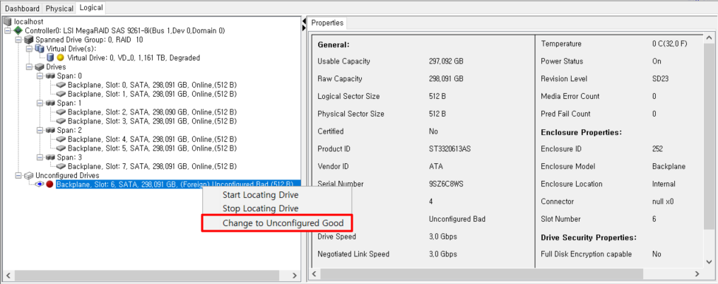 디스크의 오른쪽 마우스를 클릭해서 Unconfigured(bad)로 된 디스크를 Unconfigured(good)으로 변경시켜줍니다.