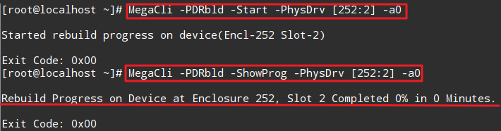 MegaCli -PDRbld -Start -PhysDrv [252:2] -a0