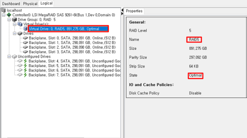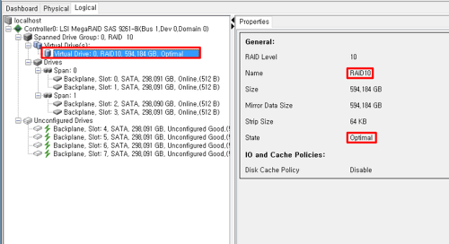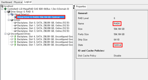 아래 사진은 RAID0으로 묶여있을 때 상황입니다. 상태는 Optimal로 되어있습니다.