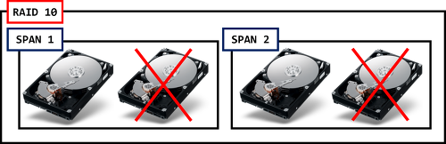 RAID10은 레이드 0과 레이드 1이 결합된 상태로, SPAN 1, SPAN 2안에 있는 디스크 2개가 레이드 1로 묶여있고, SPAN 1과 SPAN 2가 0으로 묶여있는 형태입니다.