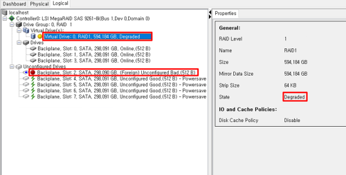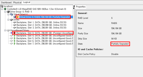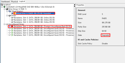 디스크가 Span 1의 있는 디스크 1개와 Span 2의 있는 디스크가 나가게 되면 Degraded 상태가 됩니다.리빌딩이 가능한 상태이며, 데이터 읽고 쓰기가 가능합니다.