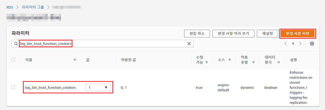 AWS내 RDS내에는 파라미터 그룹이 따로 존재하는데 이쪽에서 해당 값을 변경해주면 됩니다.